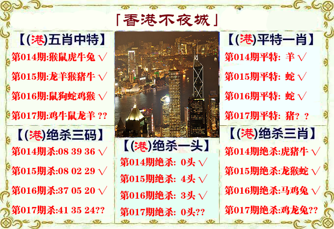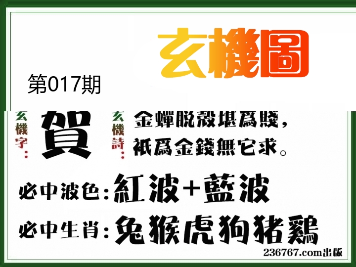 | 017期: ⑥肖 | 鸡牛狗猴马兔 | ????中 |
