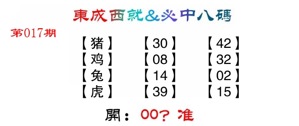 | 017期: ⑧肖 | 鸡牛狗猴马兔龙鼠 | ????中 |